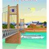 Entre son pont suspendu majestueux, ses couleurs apaisantes, et la présence du bateau fluvial glissant sur l’eau turquoise, cette illustration transporte instantanément dans une ambiance paisible et estivale.