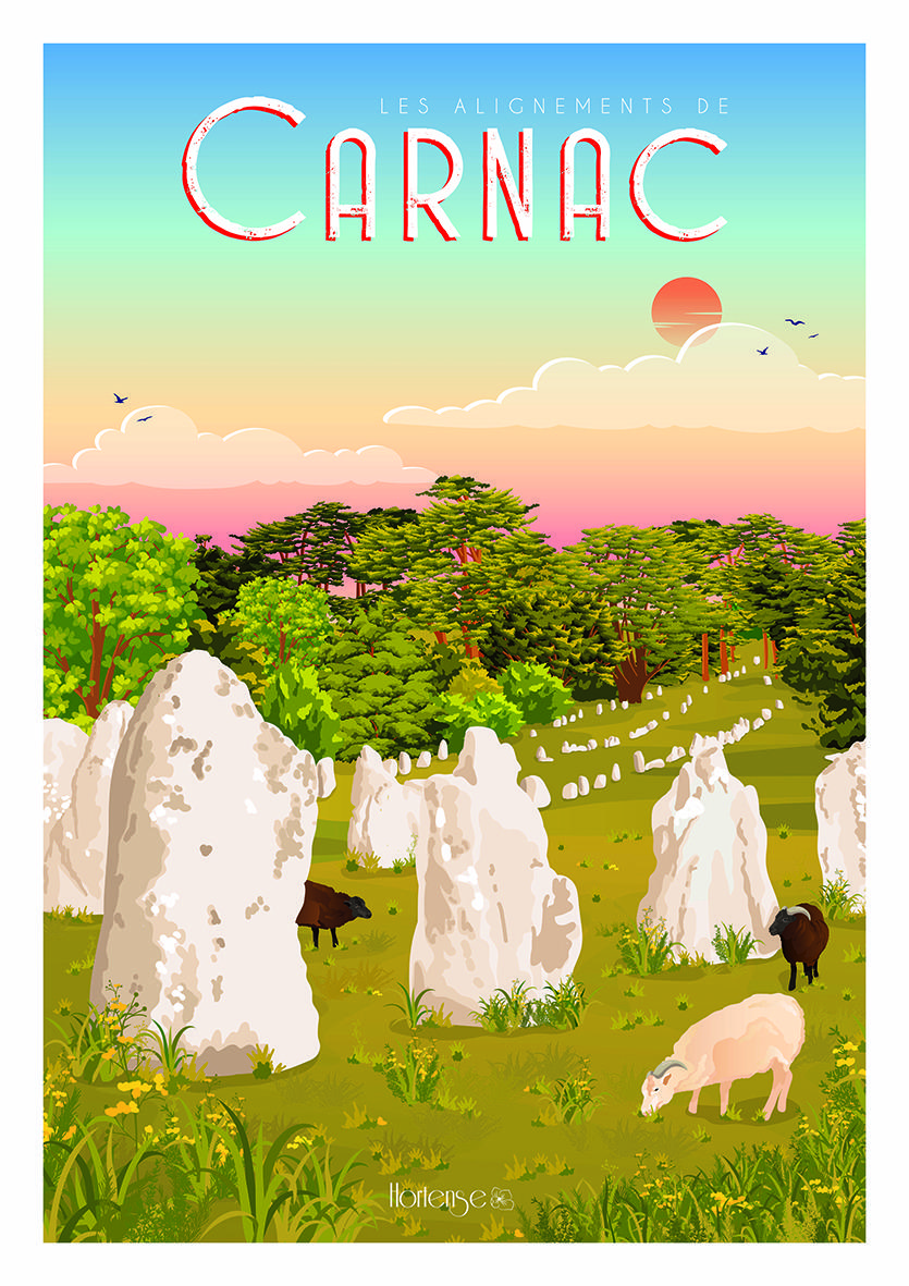 L’affiche Hortense rend hommage à la verticalité et au rythme de ces géants de granit. À travers un regard artistique contemporain, elle sublime la rencontre entre la terre sacrée du Morbihan et la douceur du ciel breton.